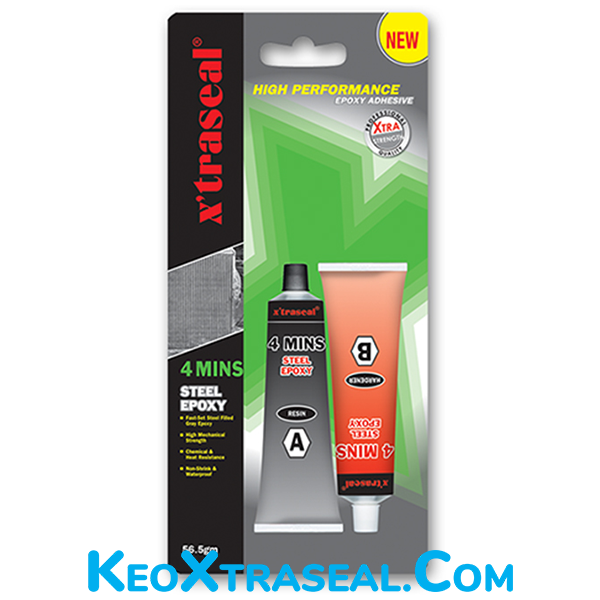 Keo dán Epoxy X’traseal 4 Minutes Steel là loại keo dán 2 thành phần khô nhanh, không bị co ngót. Nó có khả năng làm đầy các lỗ trống, các điểm trượt. Độ kết dính tốt với thép, đồng, sắt, nhựa, gỗ, bê tông, gốm sứ. Với có khả năng chịu được nhiệt độ và áp lực cao, keo được sử dụng để sửa chữa van bị mòn, vỏ bình xăng, rò rỉ bộ phận tản nhiệt, rãnh khóa bị rách, ốc vít bị lỏng…
